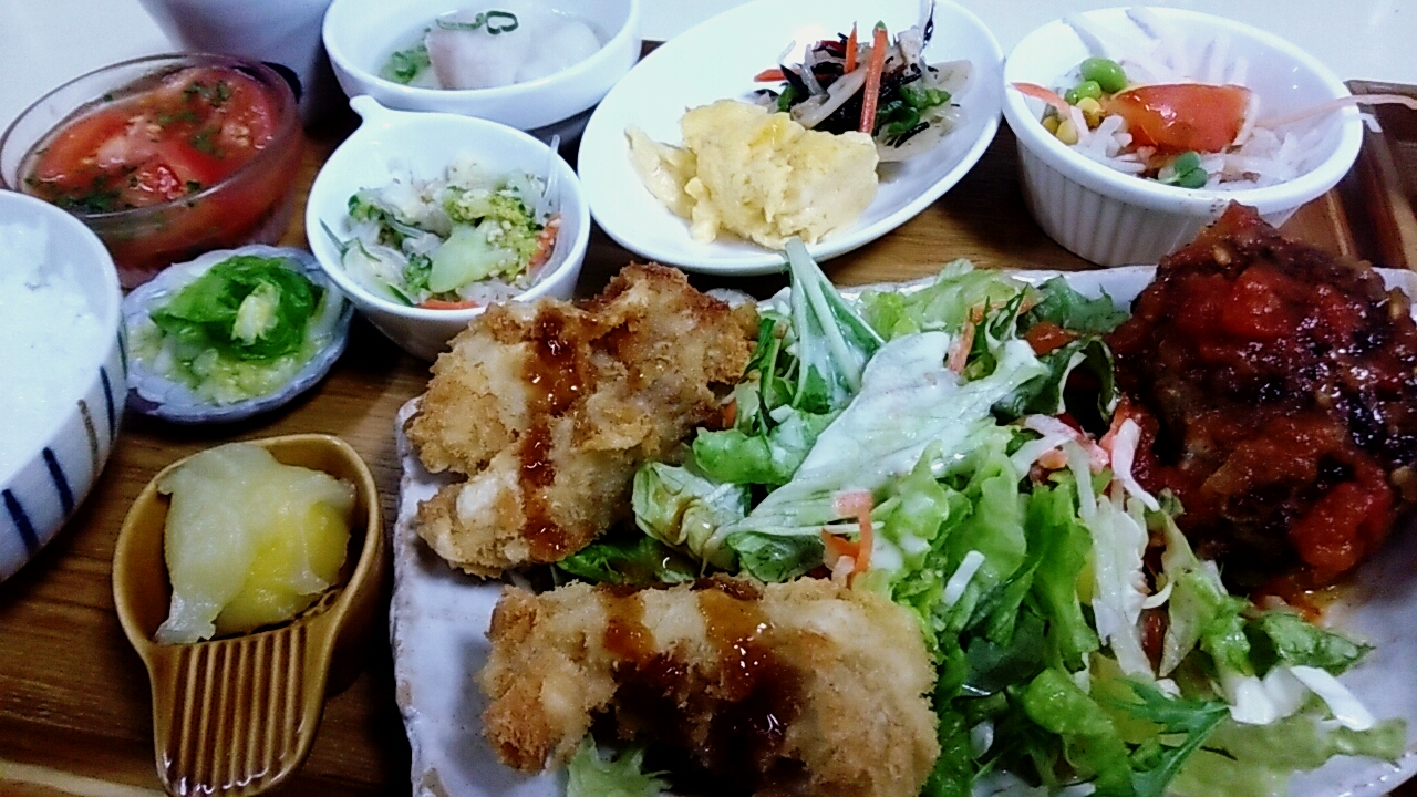 トンカツ、ミニハンバーグ、大根のうま煮、ひじきの五目煮、だし巻き卵、春雨の酢の物、トマトのマリネ、栗きんとん、茶わん蒸し、サラダ2種、ポテトのポタージュです。