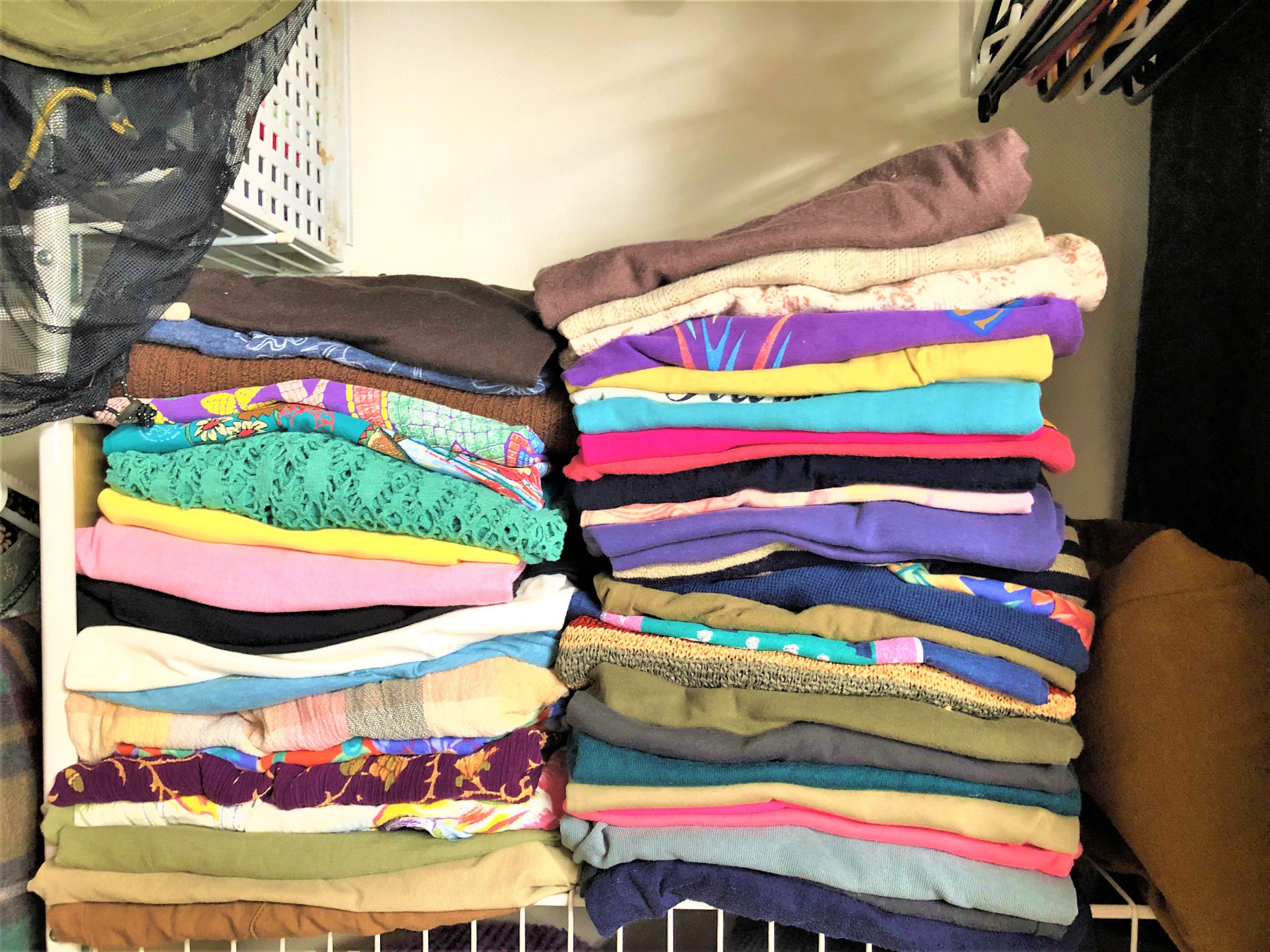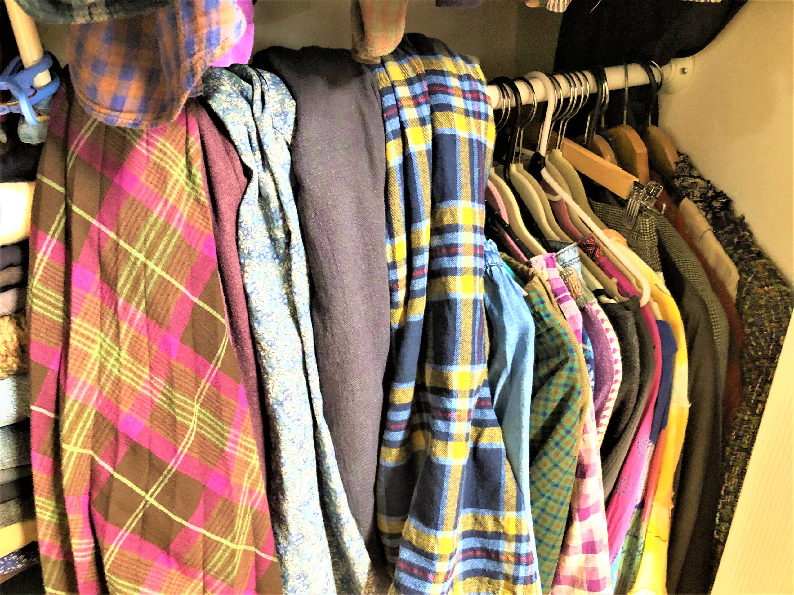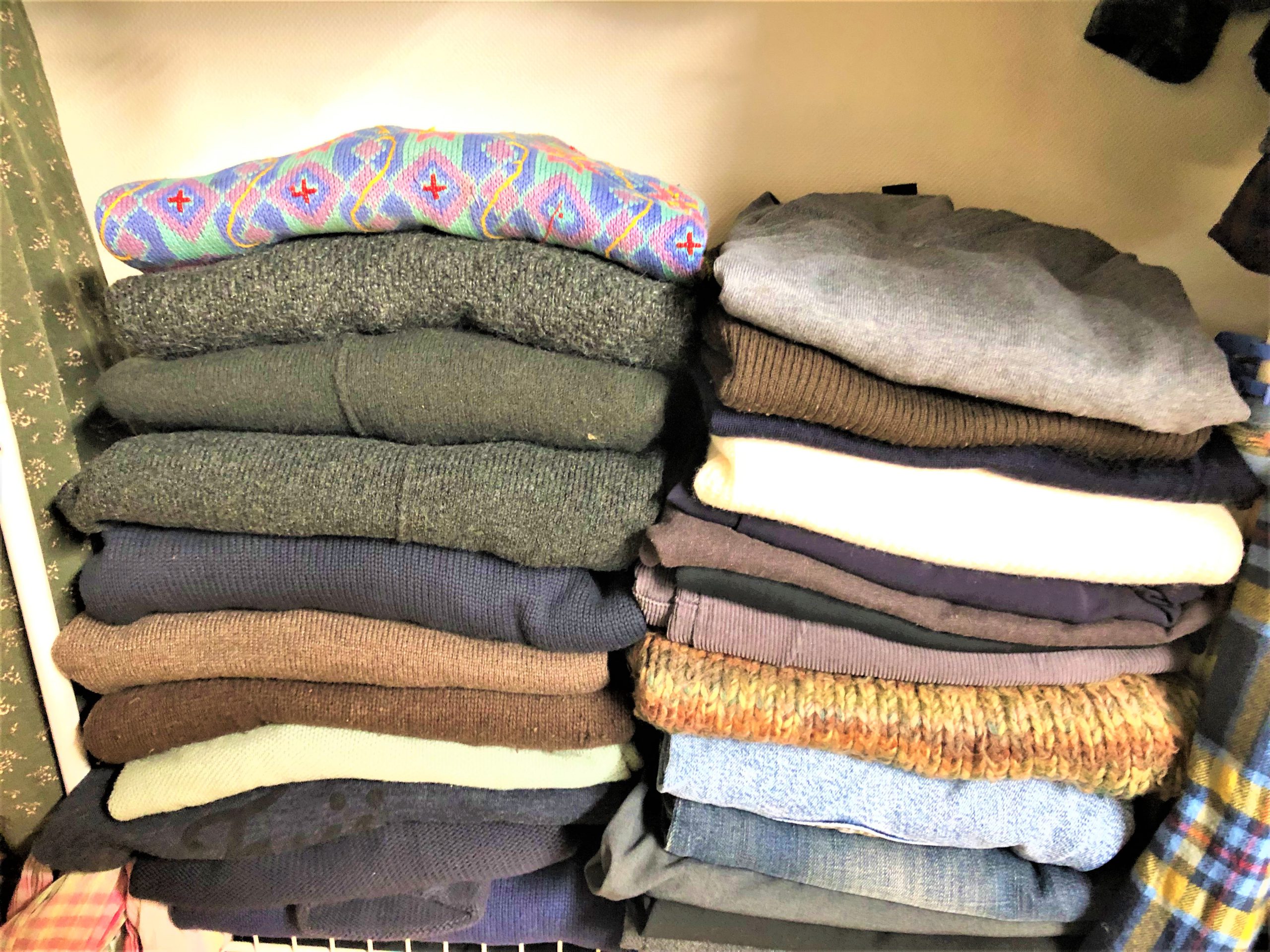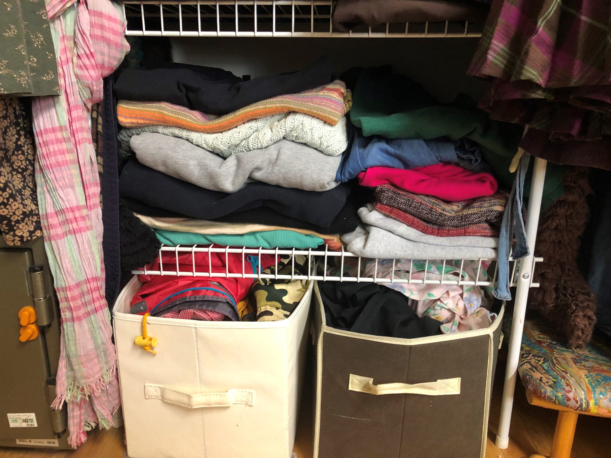 この一番上の手の届きにくい所は着古しの物ばかりでリフォームの予定の衣類です。その上のタオルで包んだものは思案中の衣類