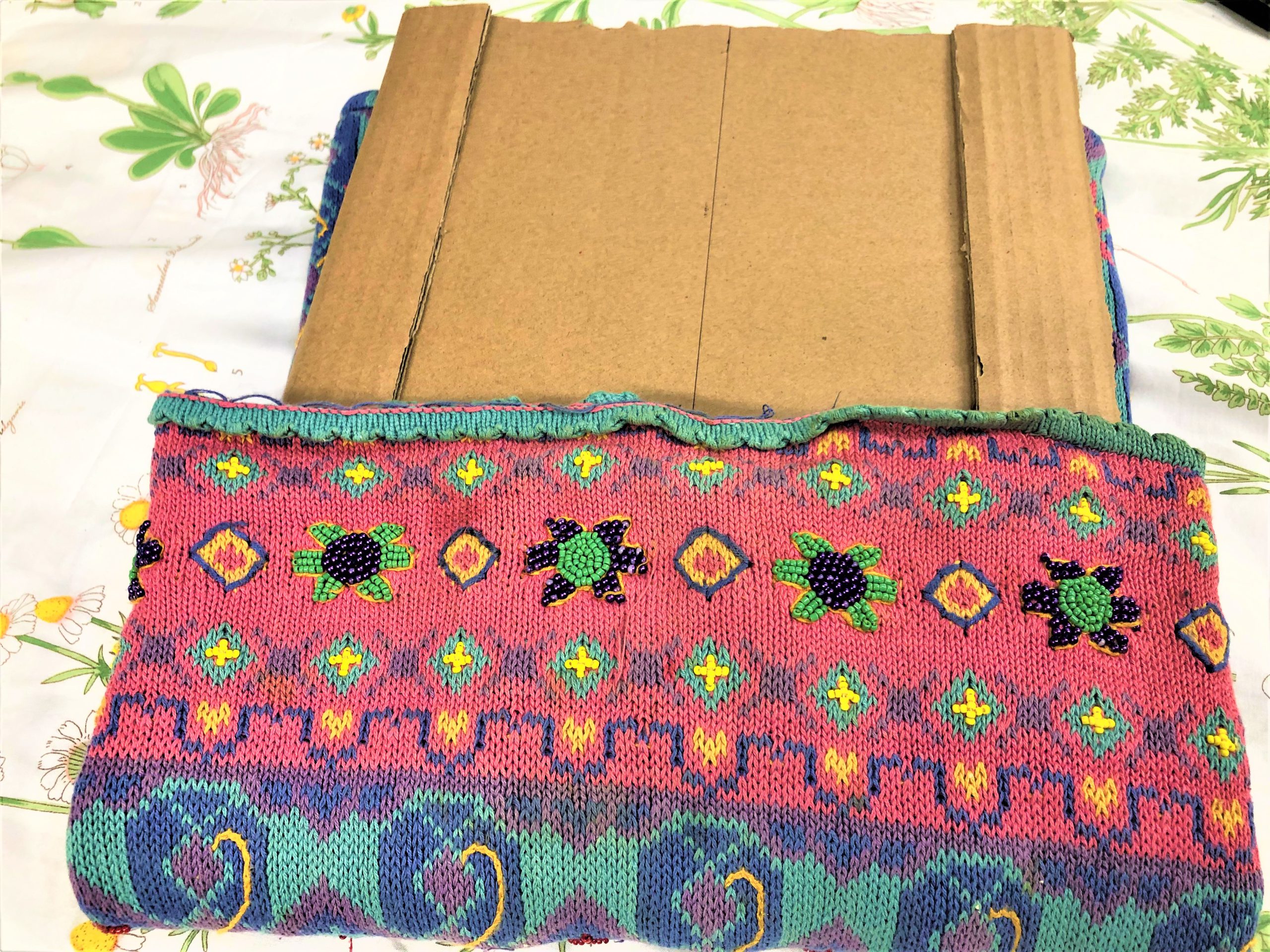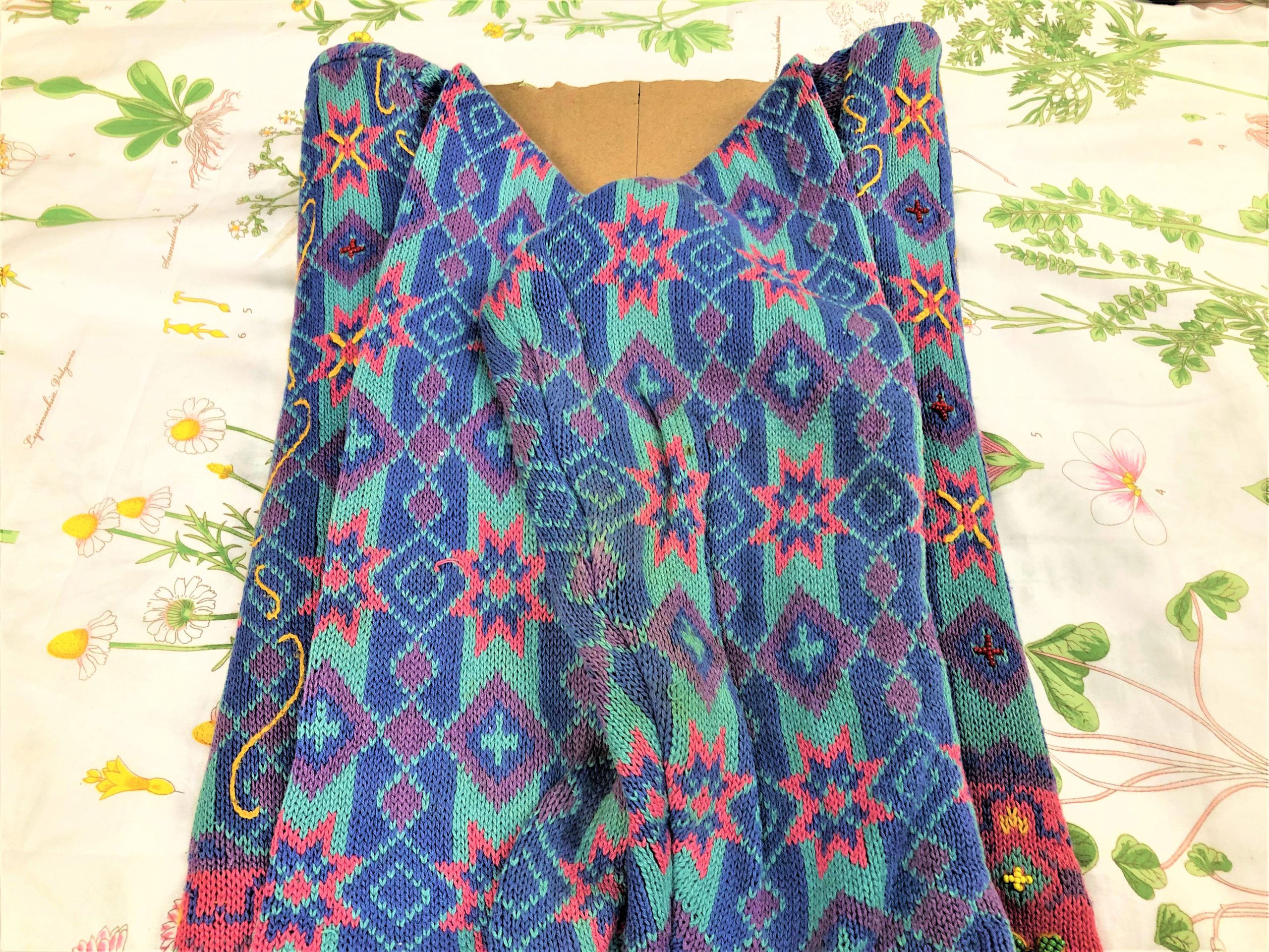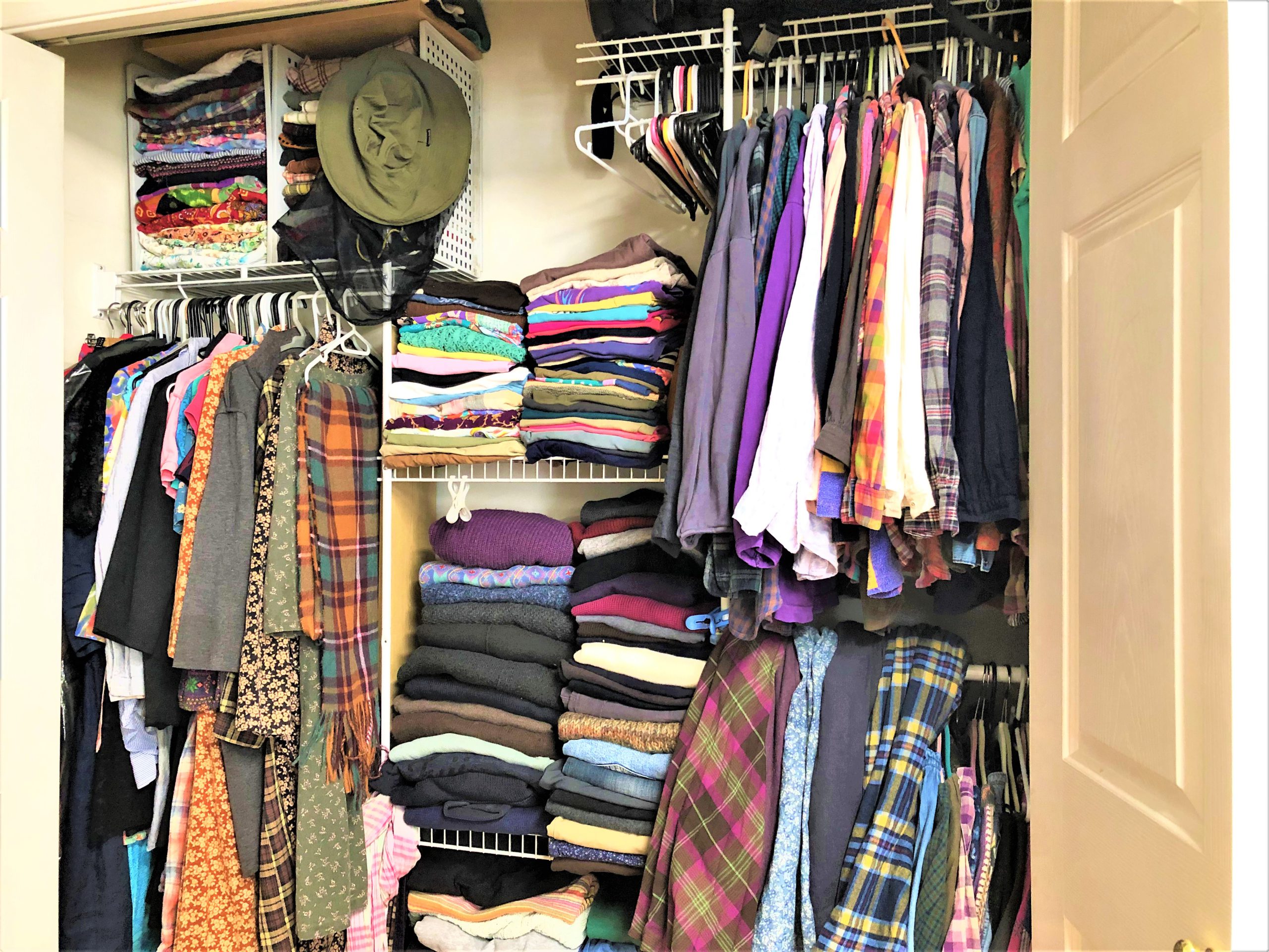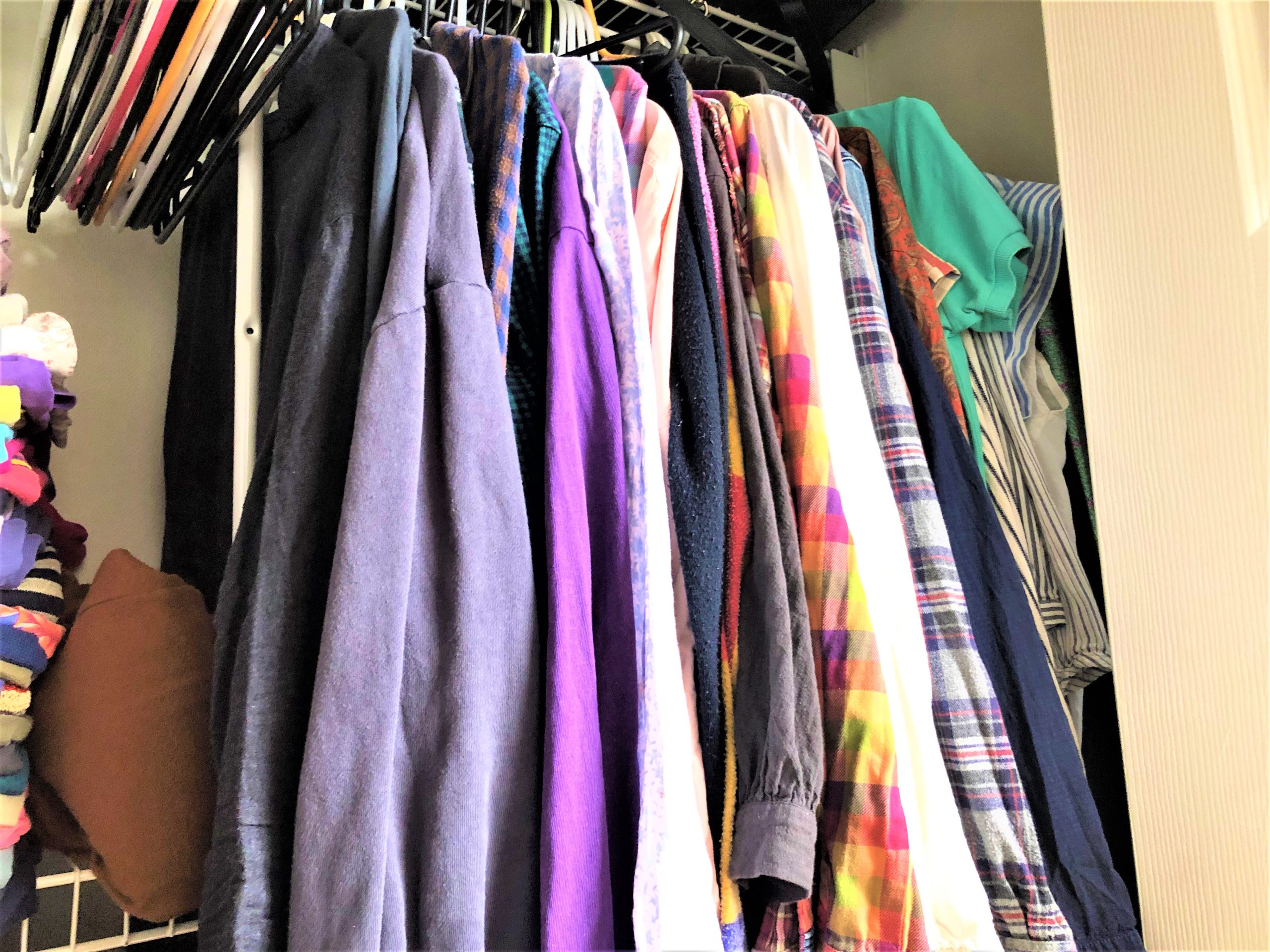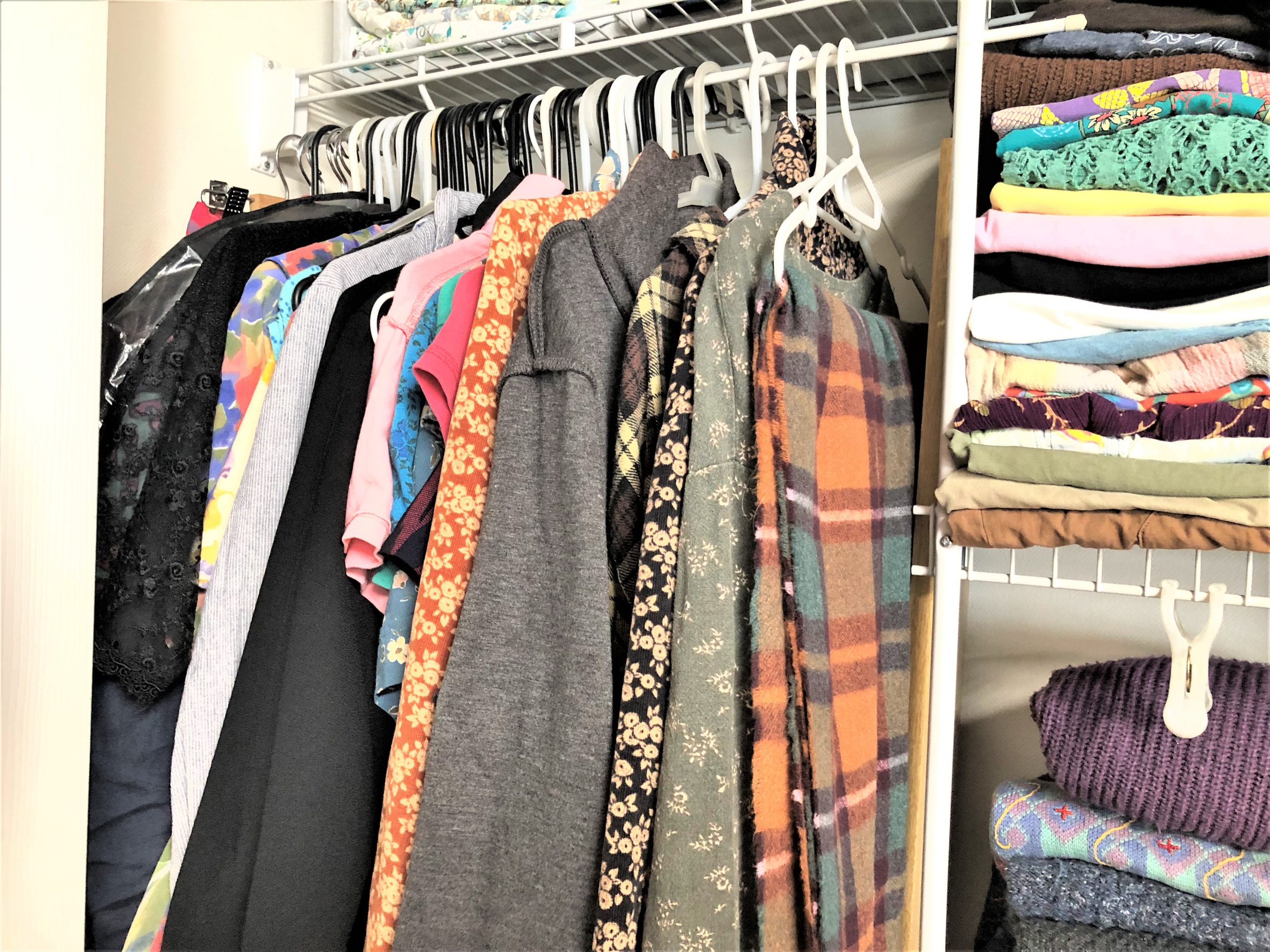 この一番上の手の届きにくい所は着古しの物ばかりでリフォームの予定の衣類です。その上のタオルで包んだものは思案中の衣類