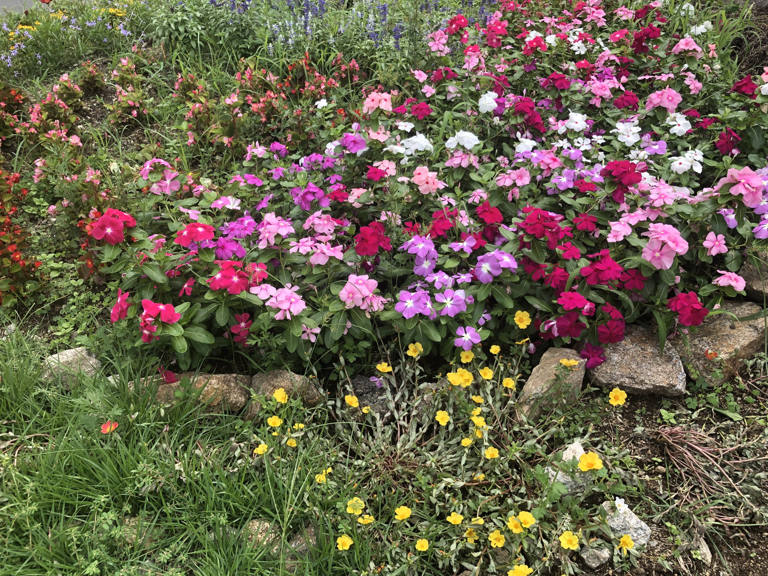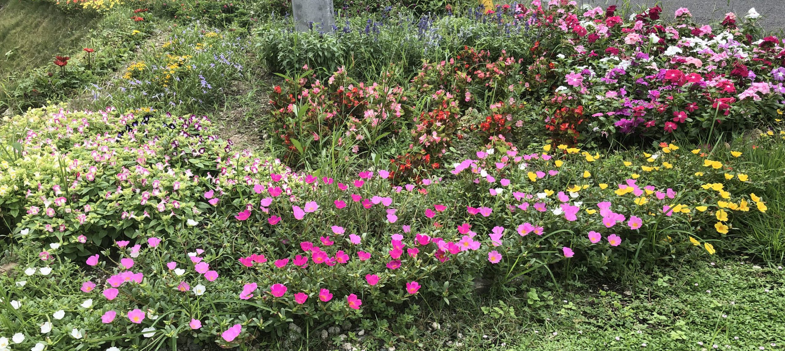 道路脇のお店の看板の花壇は 暑さに負けずに活気づいています。